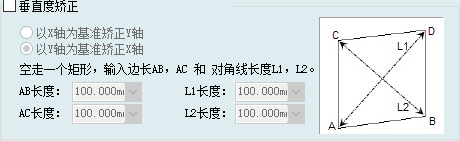 3、打开平台配置;进入机床配置界面,启用垂直度矫正;根据零件偏差方向选择以X或Y轴为基准矫正;按右侧图形示例将矩形零件测量数据填入此处,保存退出后系统会根据数据自动矫正对角线偏差。