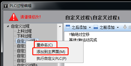 再次打开PLC过程编辑页面,在“自定义过程1”上点鼠标右键,可以进行重命名、添加到主界面的操作。