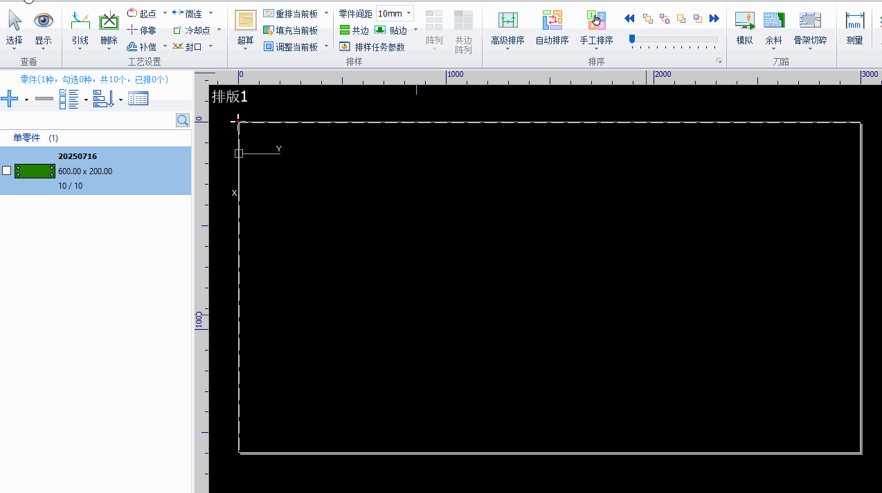 当在排样界面进行排样时,可以对零件快速阵列,使得其快速排满整个板材。